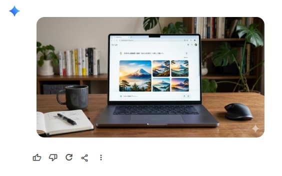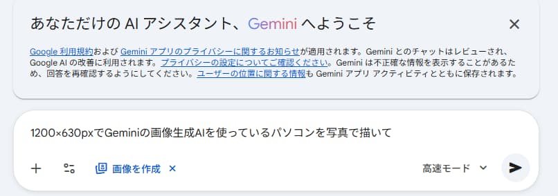画面下に画像の説明を入力する。今回は試しに「1200×630pxでGeminiの画像生成AIを使っているパソコンを写真で描いて」と入力した。